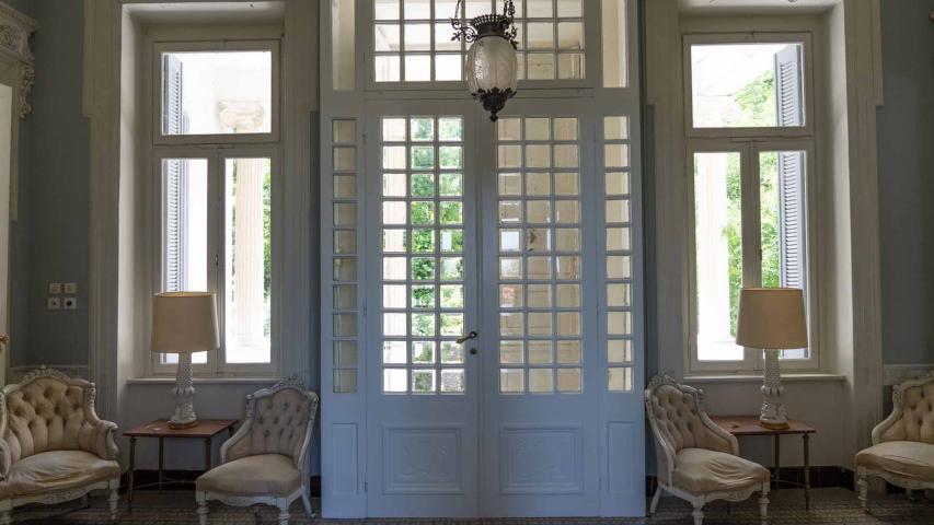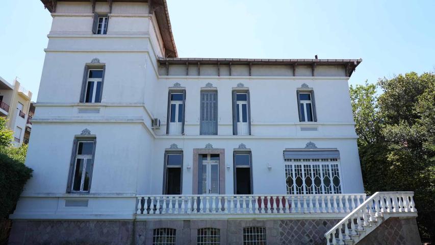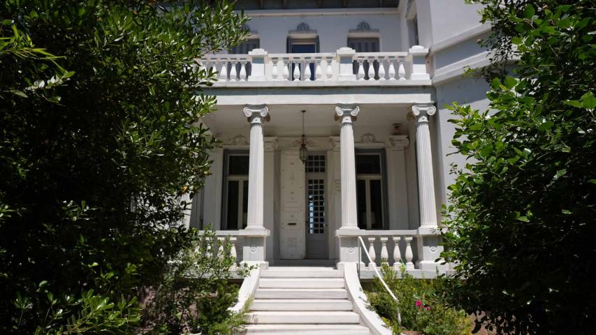 The Alepoudellis Mansion in Sourada, Mytilene, was built between 1910 and 1912 by Thrasyvoulos Alepoudellis, uncle of poet Odysseas Elytis, as a summer residence on a four-stremma seaside property. Thrasyvoulos and his brother Panagiotis were active in olive oil and soapmaking. The building was designed in Constantinople by architect Iliadis and executed by master Asimakis Fouskas. It is an imposing building with neoclassical elements, such as marble staircases and capitals, and wood-carved decorations on the roofs. The basement housed storage and the kitchen; the ground floor, reception rooms; the first floor, bedrooms; and the attic, servants’ quarters. The mansion hosted prominent figures of politics and the arts and was the setting for Elytis’ childhood and youth summers.