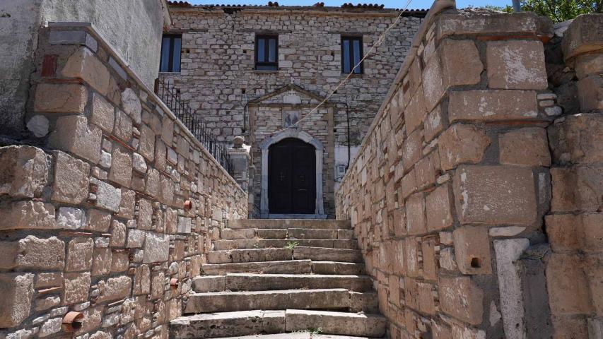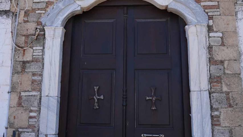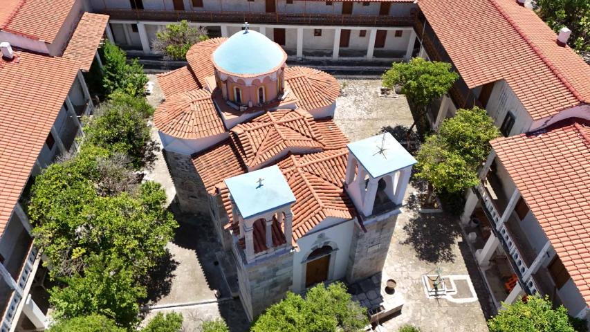 The Holy Monastery of the Holy Trinity, also known as New Zoodochos Pigi, is located at Katrafili, near Mytilinioi, and is the newest monastery on Samos. It was founded in 1824 by Hieromonk Neophytos on the site of an earlier church, while the present katholikon was erected in 1905. Architecturally it belongs to the Athonite four‑column triconch type, with the dome supported on four columns which, according to tradition, come from a building of ancient Glyfada, in today’s Pythagoreio. Notable features include the marble iconostasis (1920), the proskynetaria and the silver‑clad icon of Zoodochos Pigi (1884), while the marble bell tower of 1884, renovated in 1908, is of particular interest. The monastery celebrates on Whit Monday, has a rich library and is linked to Samos’s pilgrimage tradition.