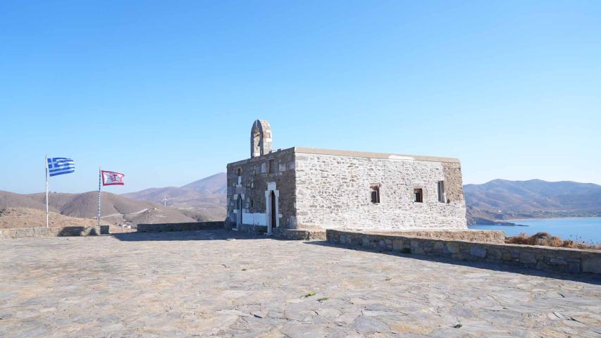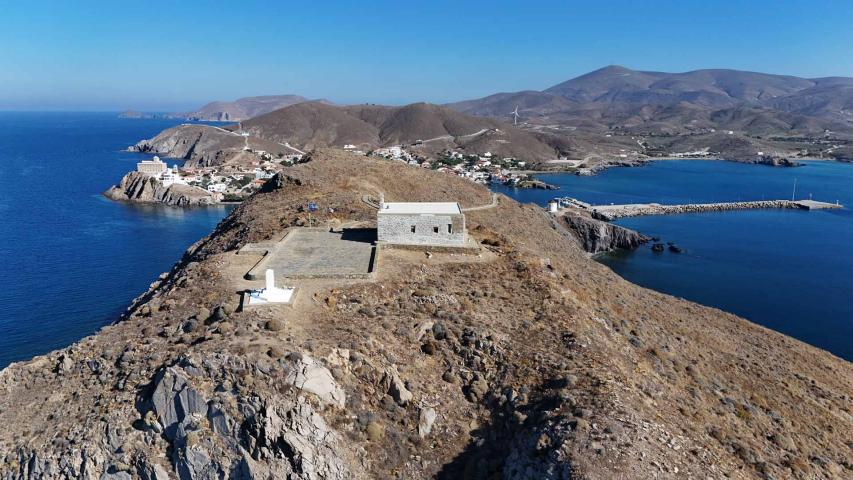 Mavri Rachi is Psara’s most emblematic historic monument. It is located at the southern tip of the Palaiokastro peninsula, which encloses the harbor on the west. At the summit stands a structure with two chapels, dedicated to Agia Anna and Agios Ioannis Prodromos. During the Greek Revolution, the Psarians fortified the spot, installing cannons and building a battery that served as a fort. Mavri Rachi is linked to the heroic sacrifice of its 120 defenders in 1824, who, seeing the struggle lost, blew themselves up rather than surrender. From that time survive a few wall sections and the rock where the powder magazine stood. Today, a simple monument recalls the self-sacrifice and courage of those who chose death over captivity.