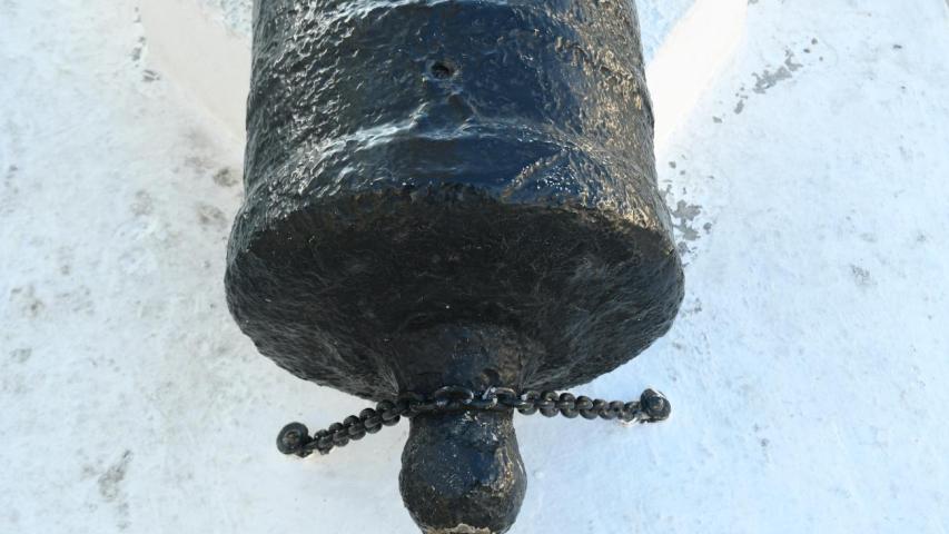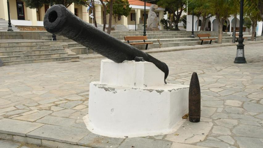Στην είσοδο του οικισμού του Αγίου Ευστρατίου εκτίθεται εμπροσθογεμές κανόνι του 18ου αιώνα, το οποίο ανασύρθηκε από τη θάλασσα κατά τις εργασίες αποκατάστασης του λιμανιού, μετά τον σεισμό του 1968. Είναι κατασκευασμένο από χυτοσίδηρο και φέρει τρεις άνισες ζώνες, χωρισμένες με πλατιούς δακτυλίους. Στο μπροστινό τμήμα ανοίγεται το στόμιο, στο κέντρο διακρίνεται ο άξονας περιστροφής και στο πίσω μέρος το πηγαίο με την οπή για το φυτίλι. Επιγραφή στον άξονα μαρτυρεί τη χρονολογία 1764 και το σουηδικό χυτήριο Stafsjö Bruk, τότε υπό τον Von Berchner. Το όπλο πιθανόν προέρχεται από ναυάγιο πολεμικού ή πειρατικού πλοίου, ίσως συνδεδεμένο με τα Ορλωφικά (1770–71) ή τον Αγώνα του 1821, όπου Αγιοστρατήτες ναυτικοί συμμετείχαν ενεργά. Δίπλα στο κανόνι εκτίθεται και μια οβίδα μεγάλου διαμετρήματος από γερμανικό πυροβόλο του Β΄ Παγκοσμίου Πολέμου, υπενθυμίζοντας τις μεταγενέστερες συγκρούσεις στο ΒΑ Αιγαίο.